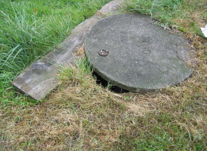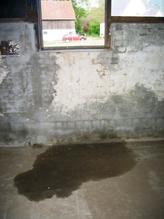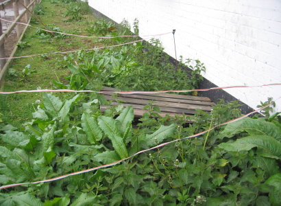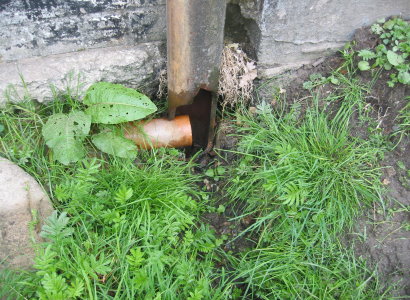 Regenrinneneinlauf in die Erde am Stall an der Halle. Dadurch gibt es außen immer Überschwemmung | |
