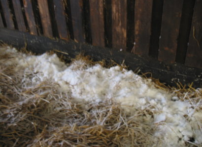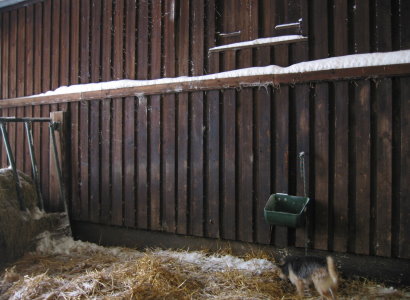 Großer Laufstall  | |  | |  | Das Dach im großen Laufstall ist in der Verbindung zum Futterlager undicht. Wenn es regnet, sammelt sich das Wasser in den Futtertrögen, von der völlig durchnässten Liegefläche gar nicht zu sprechen | | Im Winter schneit an der undichten Stelle richtig rein, da lag schon bis zu 1m Schnee | | Wie man links sieht, schneit es dann auch kräftig auf das Heu | | | | | | |