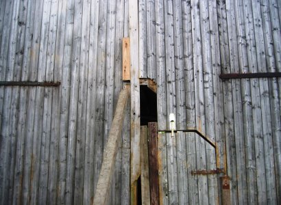 Nicht nur an einer Stelle, sondern wie man anhand der Schnees sieht, an mehreren Stellen Das eine Tor zur Halle ist völlig verzogen, wie man hier am Rahmen sieht. Dadurch ist es gefährlich, das Tor zu öffnen. Außerdem schließt es nicht richtig. | |  |