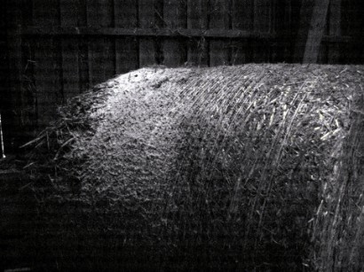 Die Dachverbindung Futterlager / Großer Laufstall ist auch zum Futterlager hin undicht. Bei starkem Regen bilden sich am Boden des Futterlagers Wasserpfützen, die Ballen werden nass und schneien z.T. ein.
