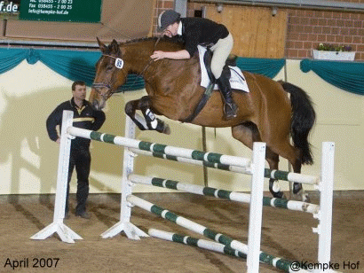 Eigenleistung: Die ersten Turniereinsätze 2007 in Deutschland waren mit Platzierungen in Springpferde A erfolgreich. Seit 2008 ist sie in Frankreich im Amateurspringsport bis 1,30m hoch erfolgreich.